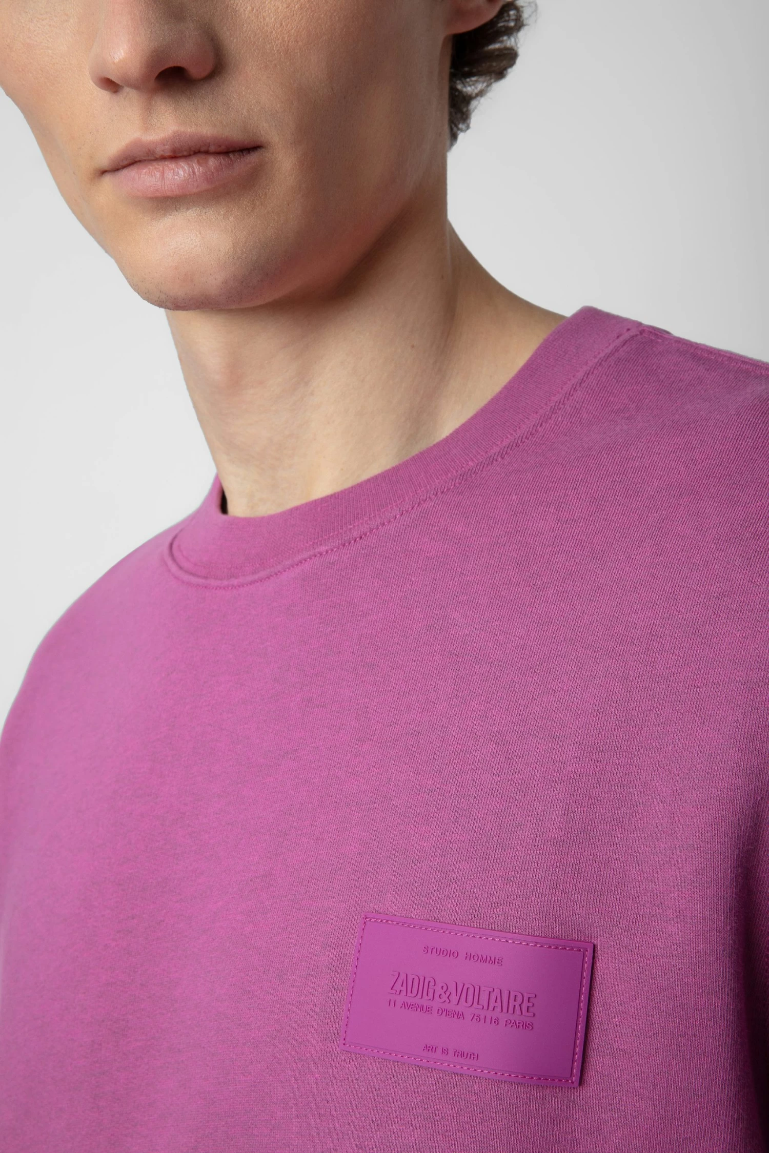 Fuchsia long-sleeved round-neck sweatshirt with patch on the chest.
