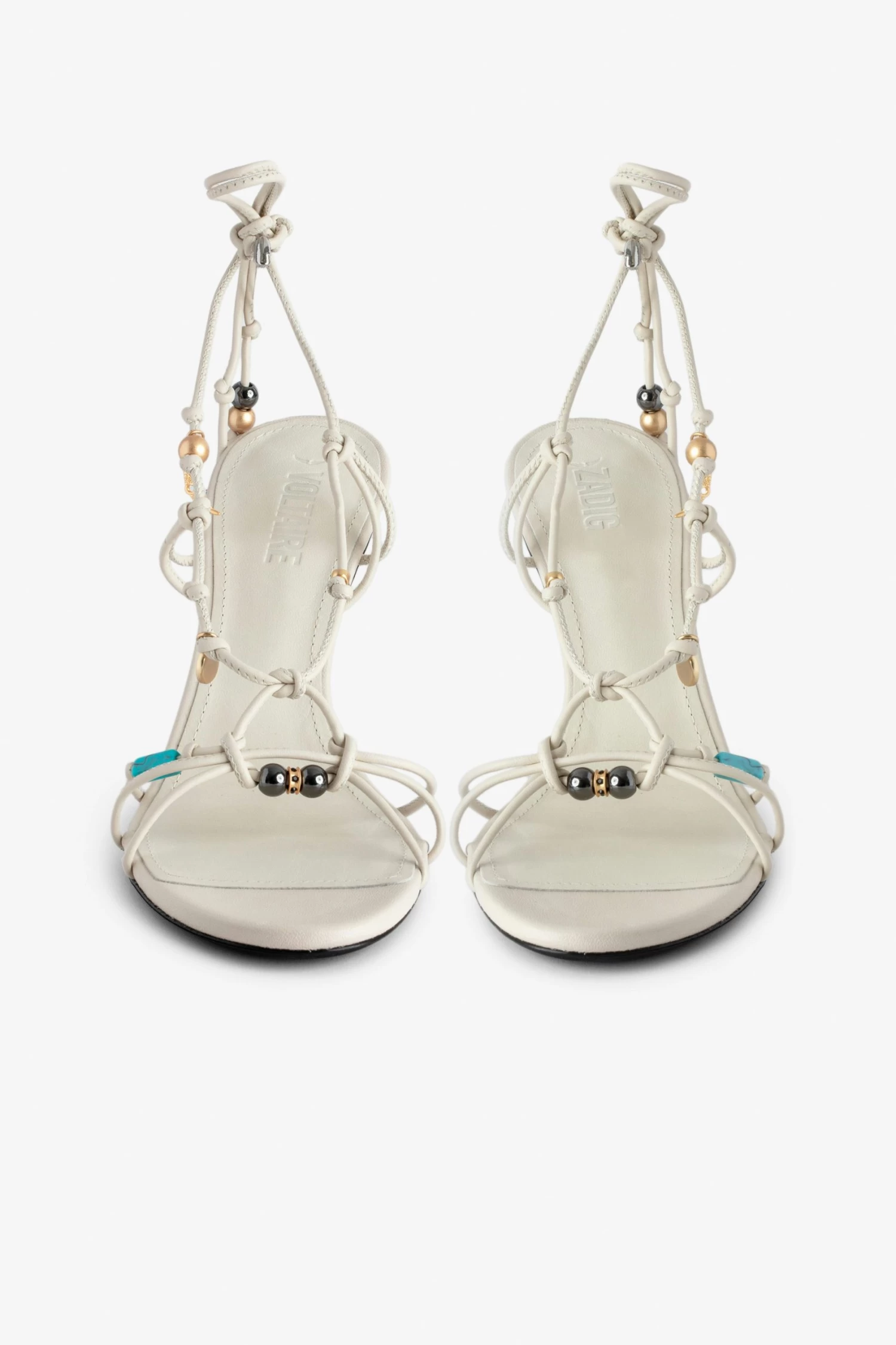 Women’s white smooth leather heeled sandals with tied straps and charms.