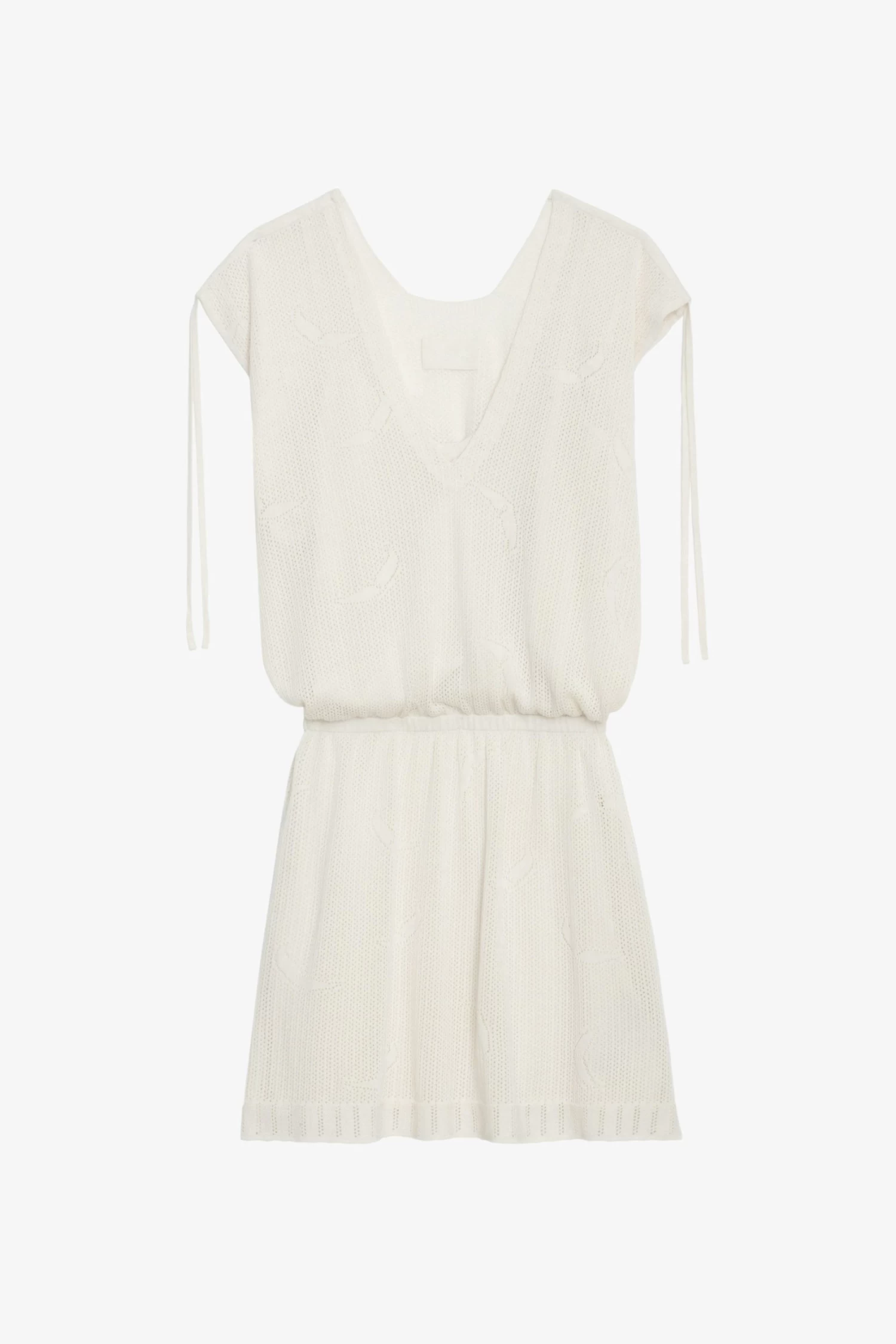 – Women’s ecru lace cotton mini dress – Openwork wings motifs – V neckline and short sleeves with drawstring ties – Elasticated waistband Model is 178 cm / 5′ 10″ and is wearing a size S*100% of fibers comes from organic agricultureThe GOTS certification guarantees that this product does not contain GMOs. It also ensures the absence of harmful substances in the product, a social and environmental responsible management and the end-to-end traceability of the supply chain. The dyes are made with GOTS approved inks and colorants, which do not contain toxic heavy metals and do not require aromatic solvents nor harmful substances.