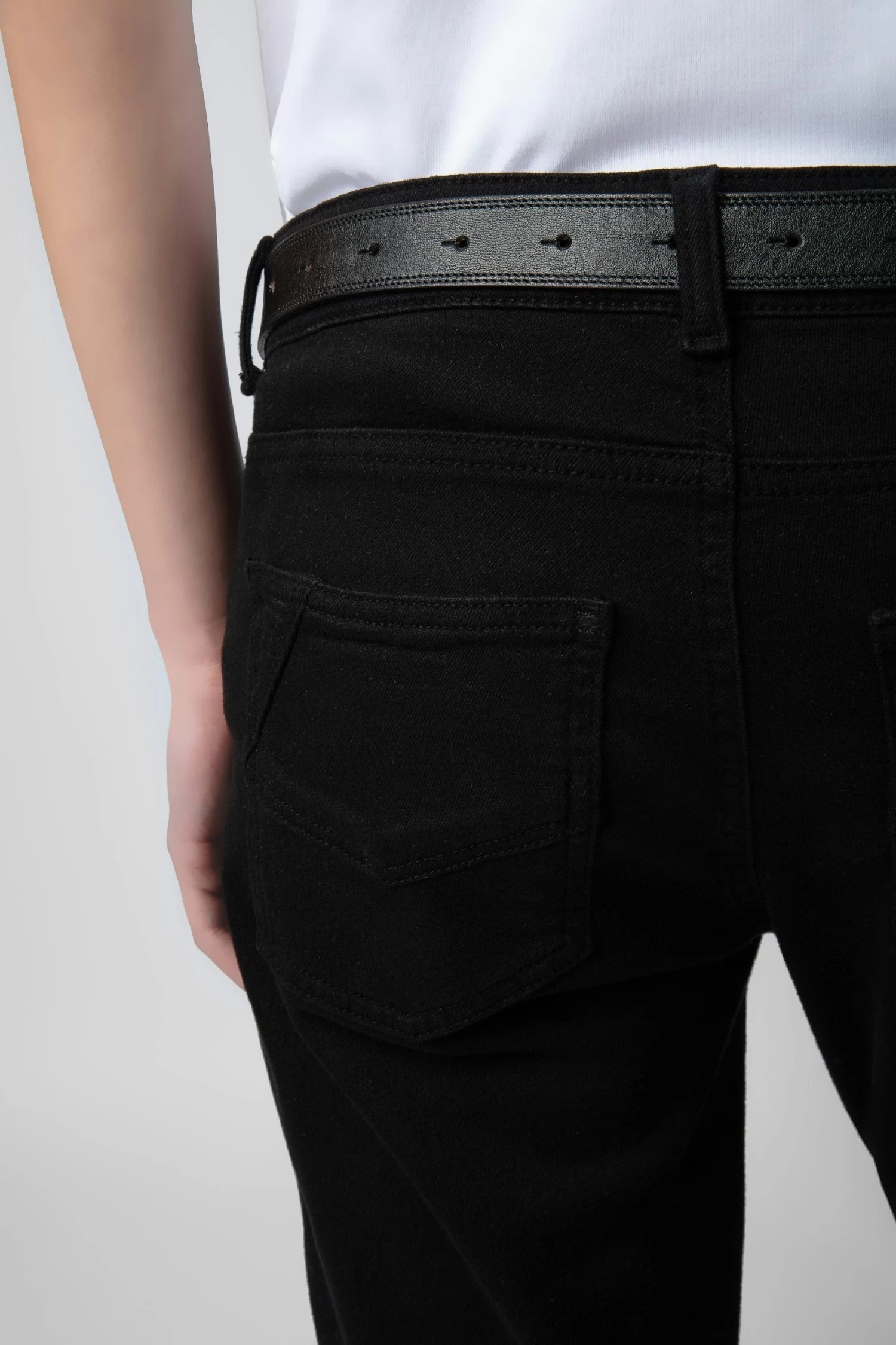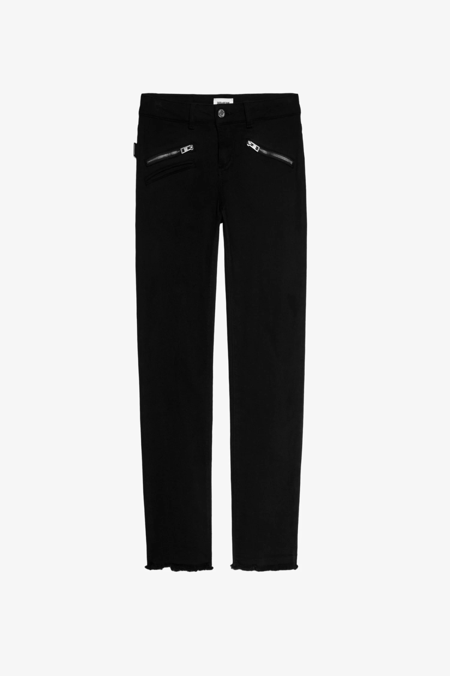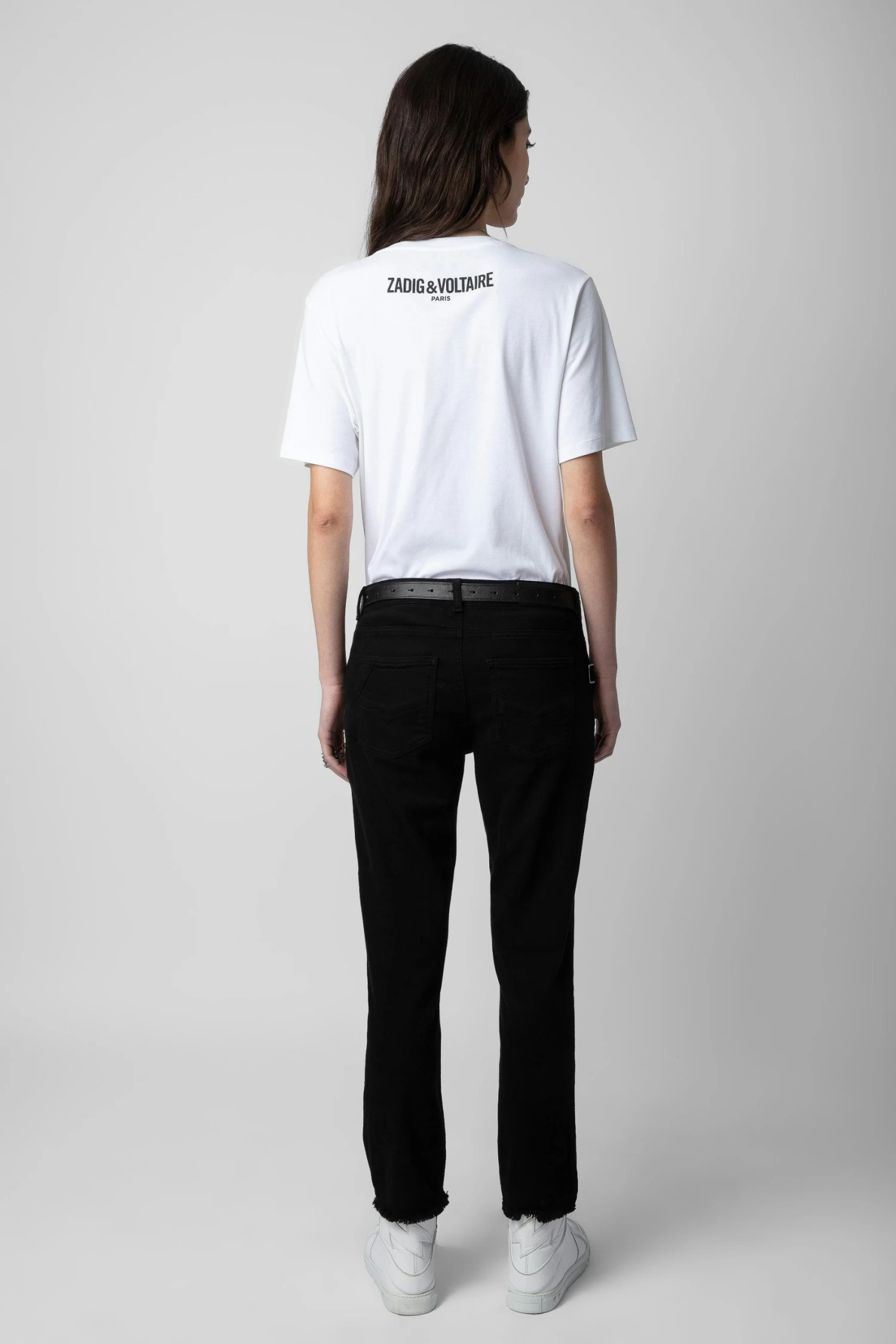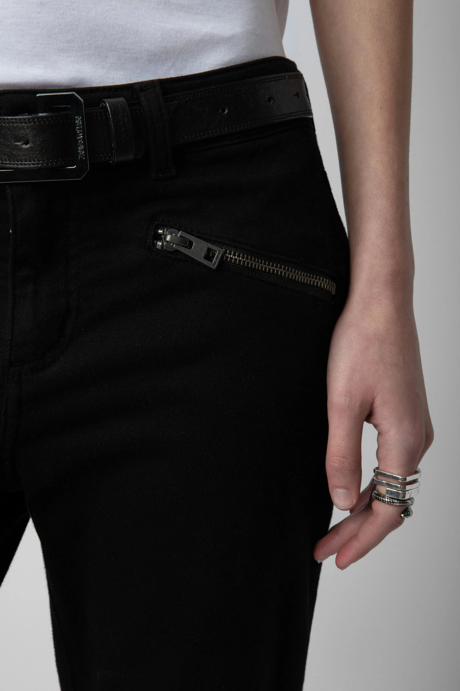 – Women’s black cotton slim-fit jeans – Shorter ankle length – Raw hems – Zipped front pockets – 1 welt pocket – Belt loops – Metal half-moon on the sides – ZADIG&VOLTAIRE leather label on the back