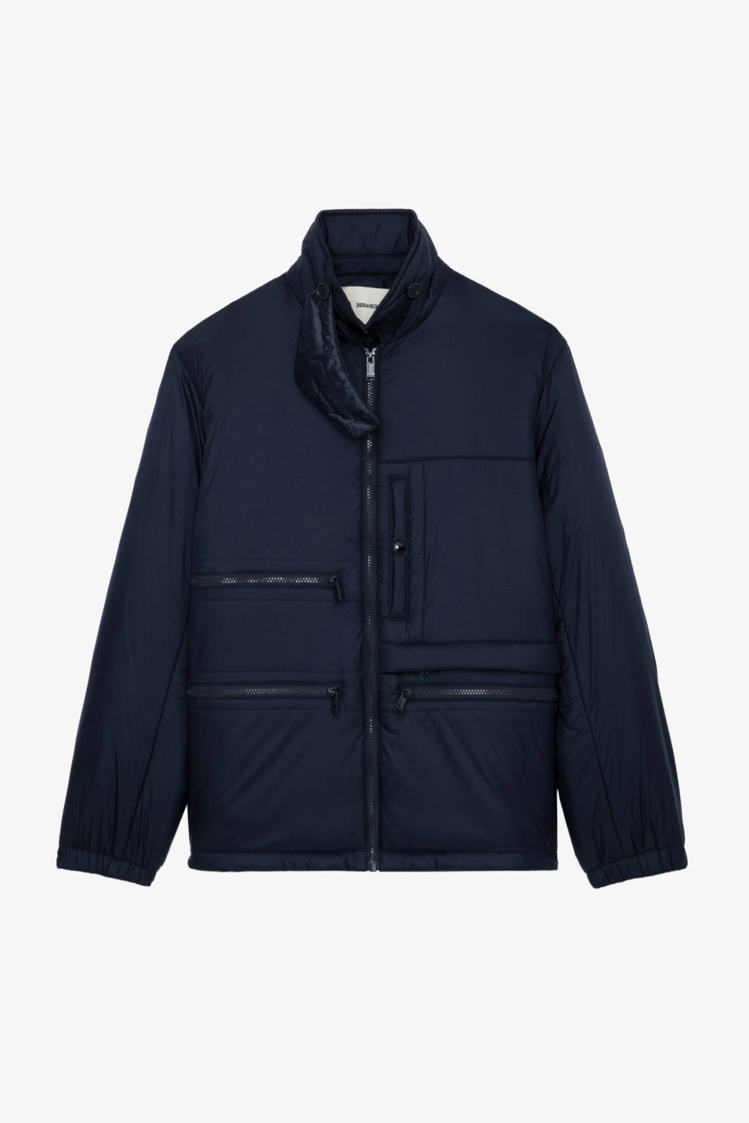 Navy blue padded jacket with mock neck and long sleeves.
