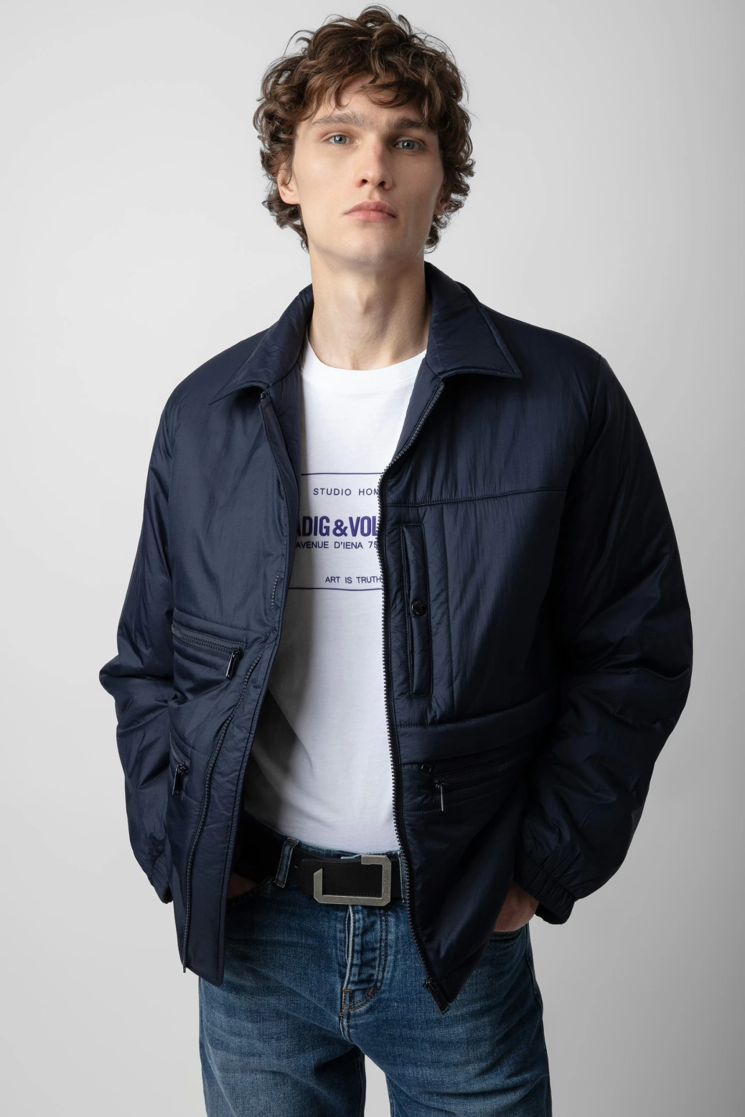 – Men’s Encre navy blue jacket – Mock neck with removable tab featuring embossed Studio Homme branding – Zip fastening and rubber Studio Homme badge on the back – 4 zip pockets and 1 chest pocket with snap button – Long sleeves and elasticated cuffs Model is 187 cm / 6′ 1″ and is wearing a size M*Contains 100% of recycled polyamidGRS certification guarantees the presence and quantity of recycled material in the product. It ensures a social, environmental and chemical responsible management, as well as an end-to-end traceability of the recycled material through the supply chain.