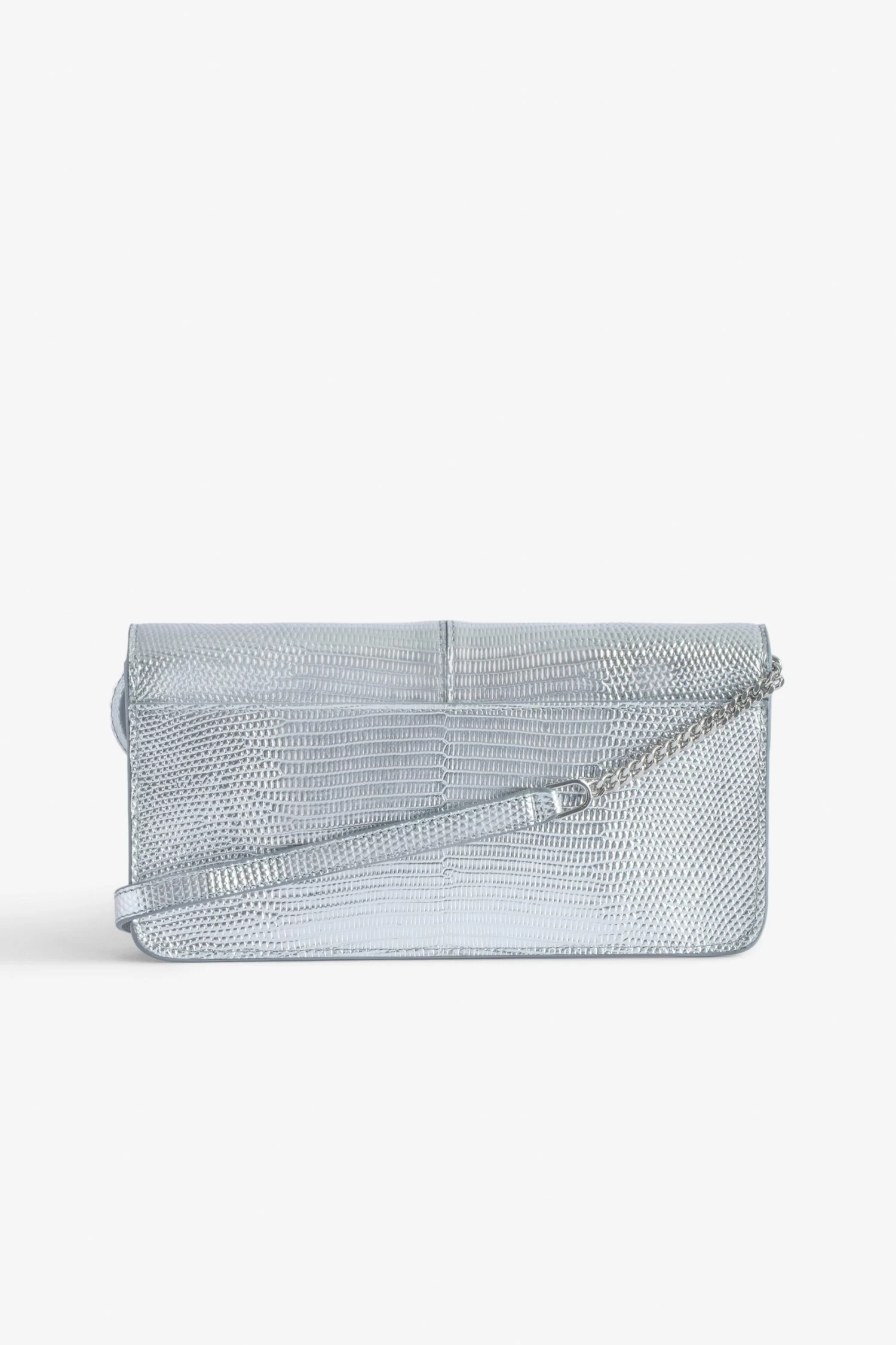 Silver metallic iguana-embossed leather clutch with leather and metal chain shoulder strap.