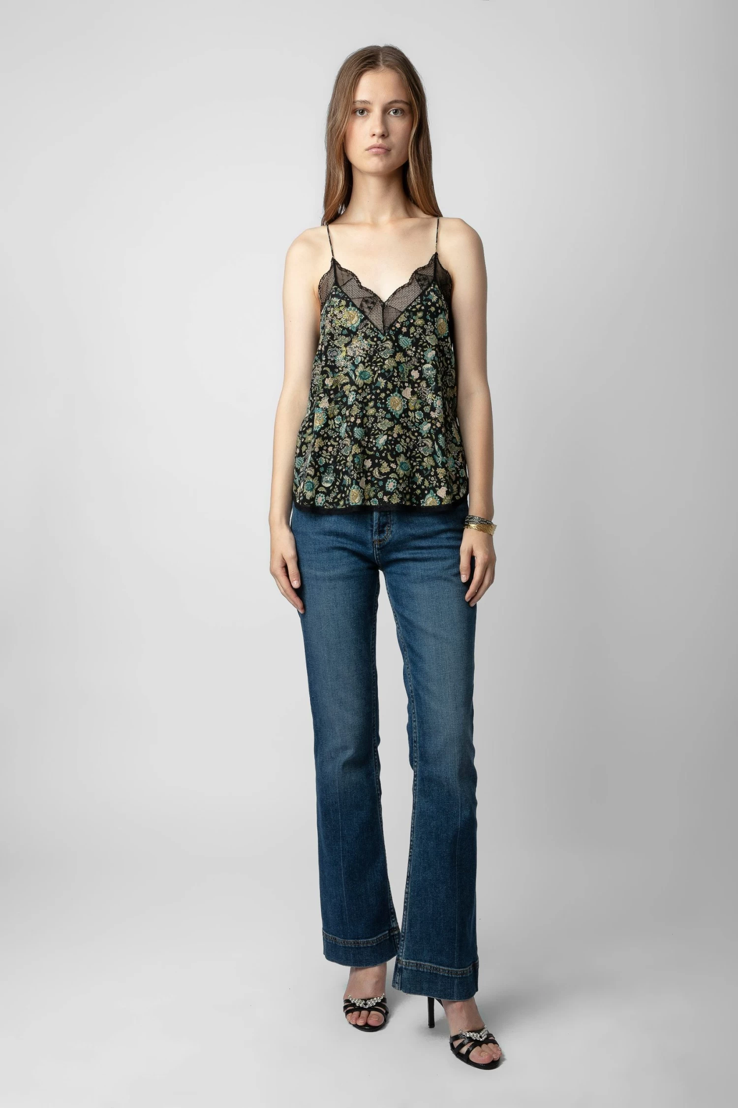 – Women’s black camisole – Floral-print silk – Diamanté details throughout – Lace neckline and trim – Thin non-adjustable straps Model is 180 cm / 5′ 10″ and is wearing a size S