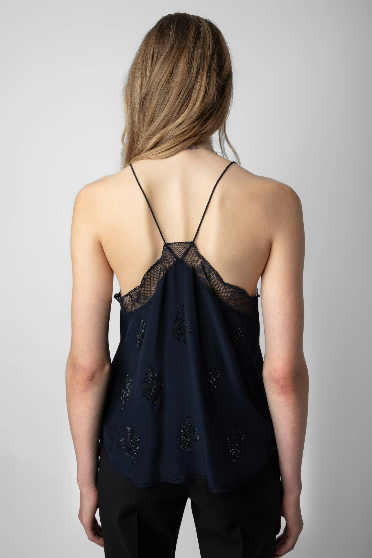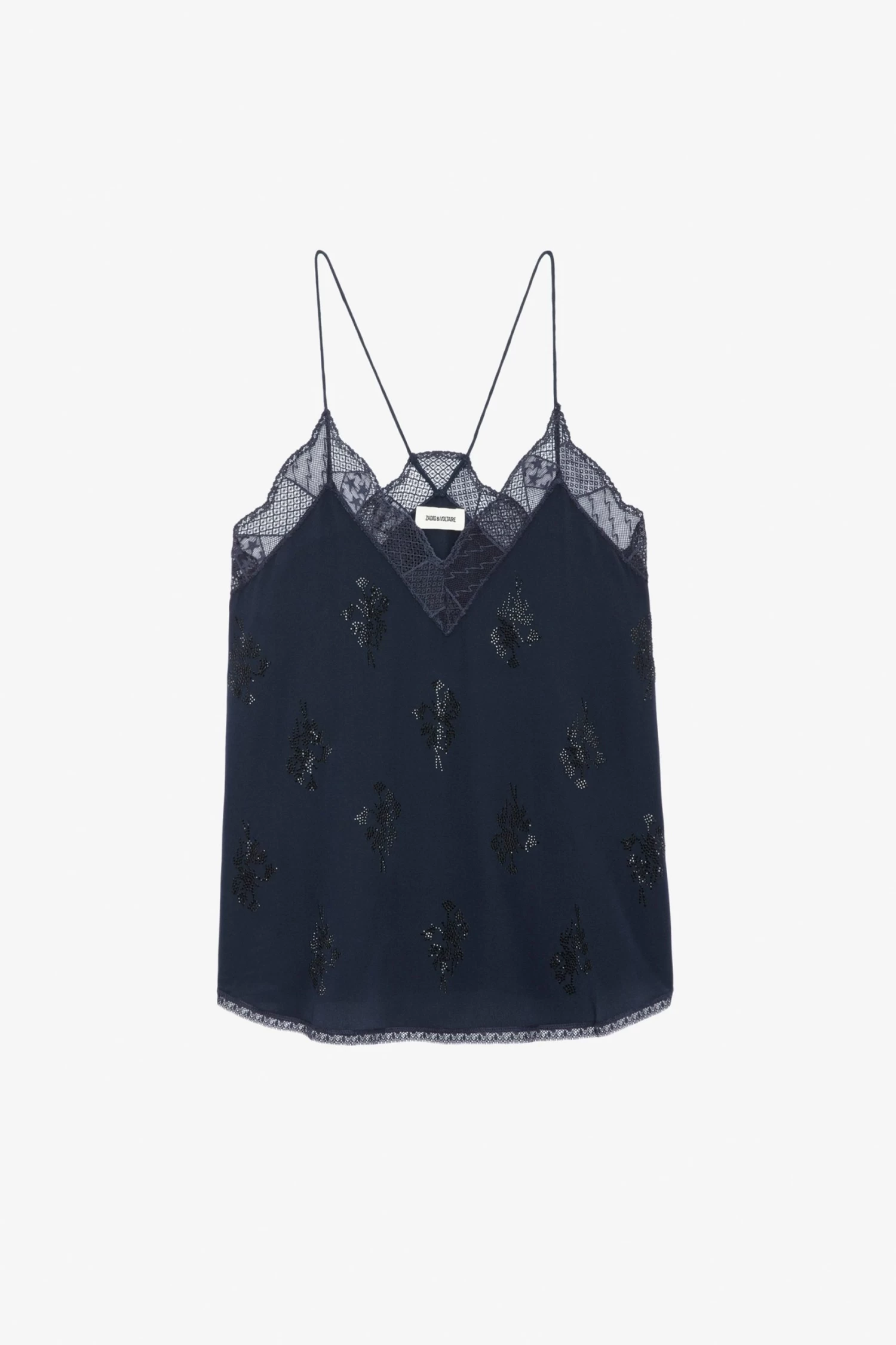 Navy blue silk camisole with thin straps, diamanté-embellished motifs and lace-trimmed neckline.