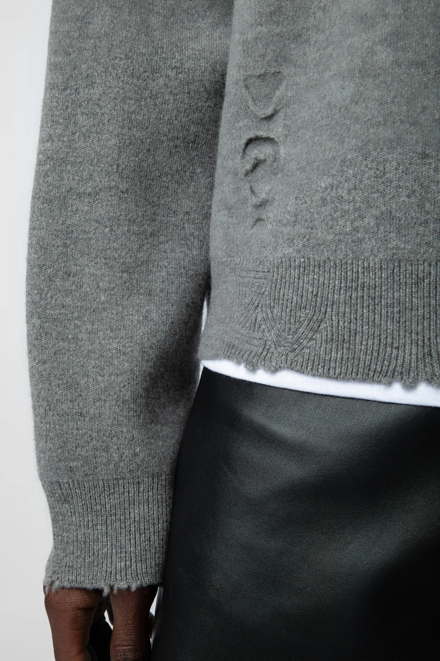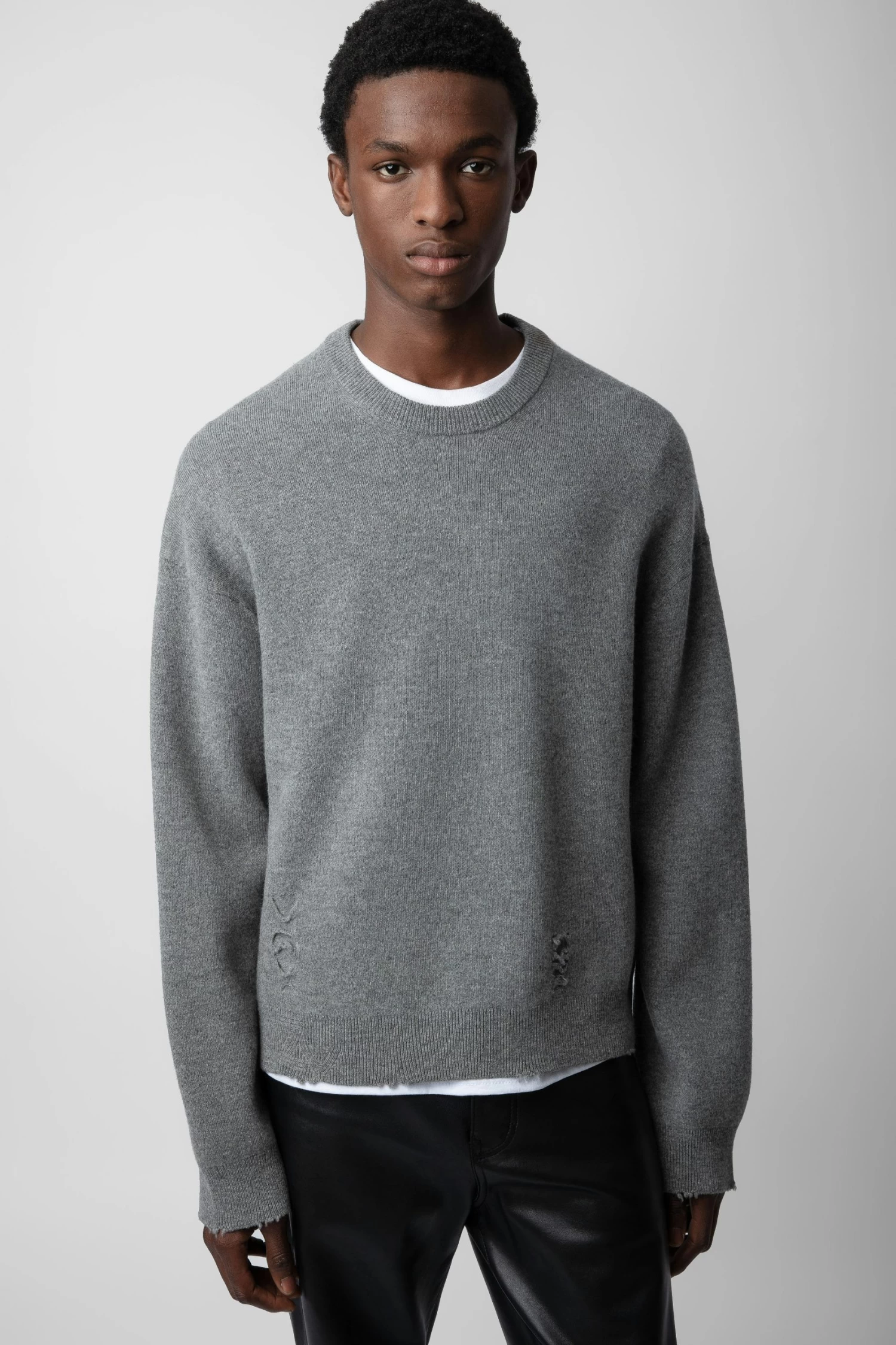 Grey distressed-effect wool jumper with long sleeves and round neckline.