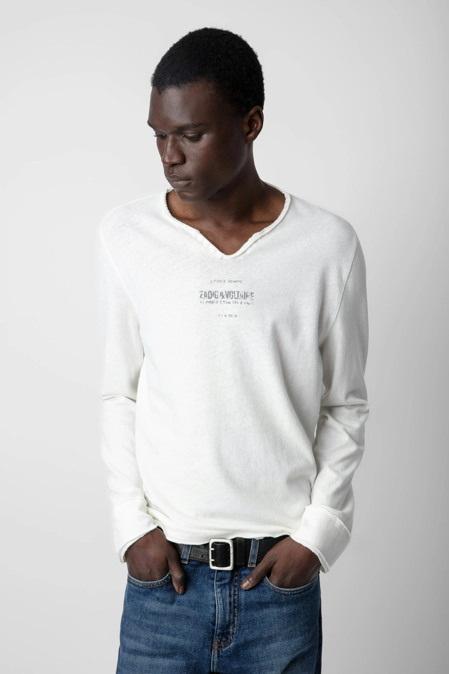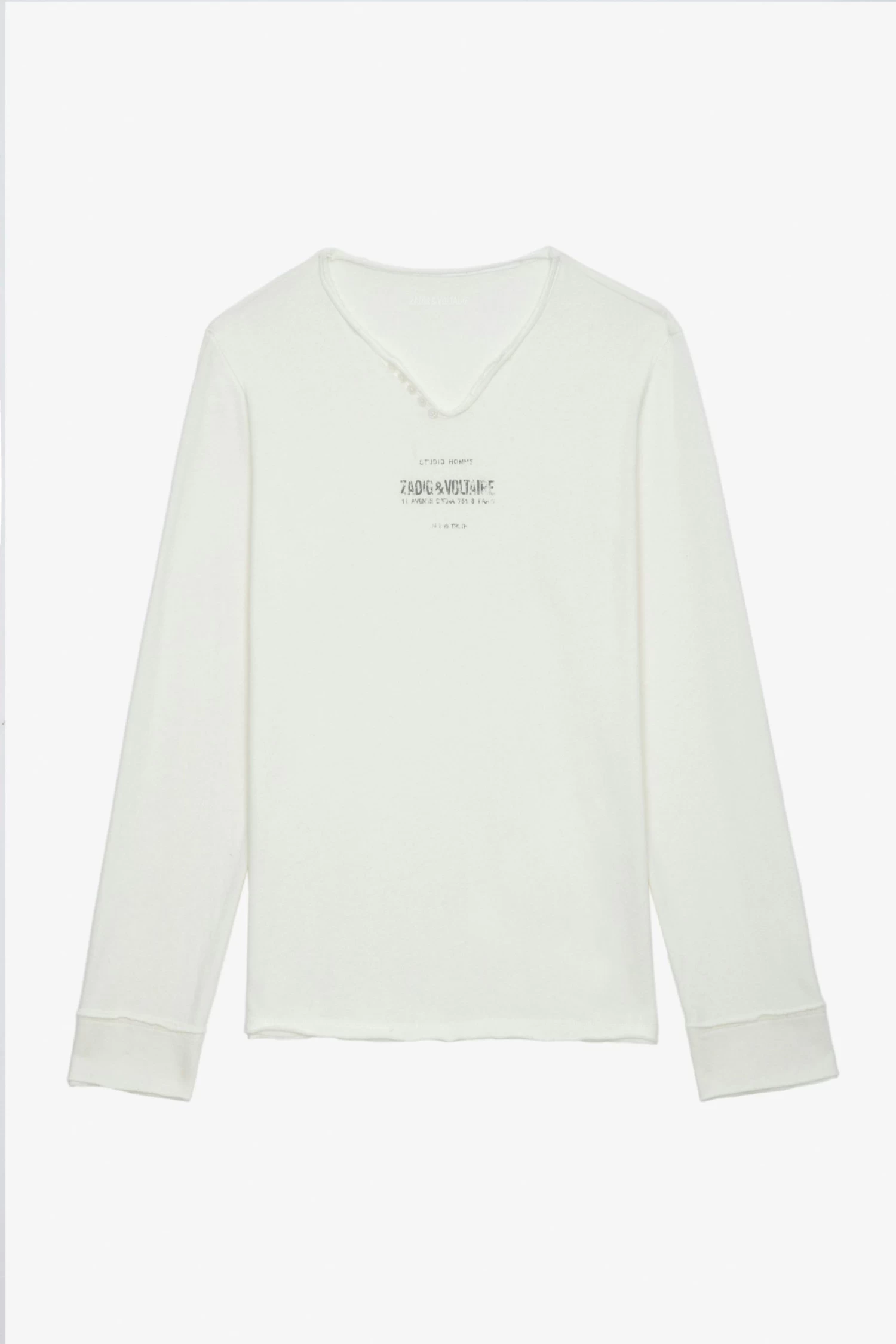 Men’s white washed linen T-shirt with Henley neckline and printed Studio Homme insignia.