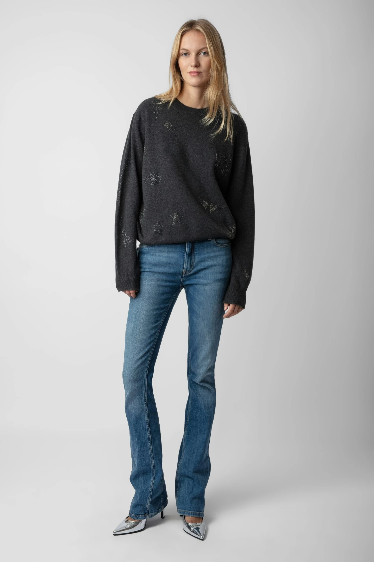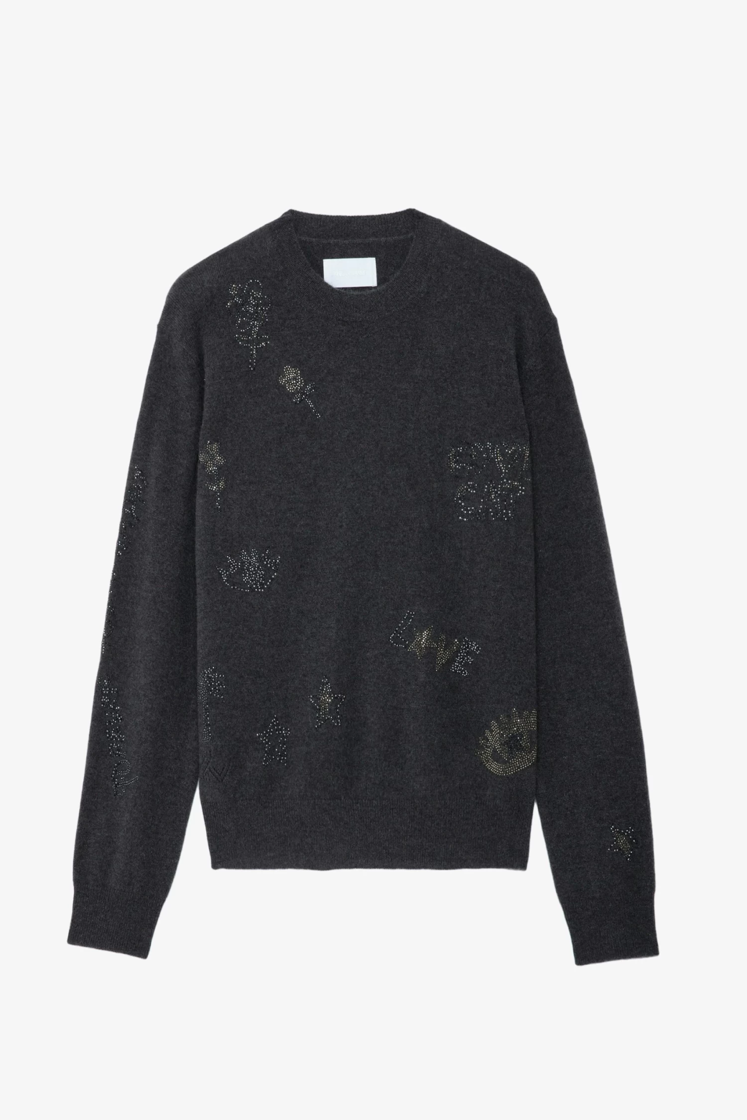 Customized details designed by Humberto Cruz, an artist and illustrator from San Diego. Influenced by pop culture, fashion and colors, he describes his work as spontaneous and quirky. – Women’s Slate khaki grey cashmere sweater – Round neckline – Long sleeves and ribbed trim – Diamanté slogans Model is 180 cm / 5′ 10″ and is wearing a size S The cashmere for this product is produced according to The Good Cashmere Standard® by AbTF. The standard ensures the welfare of the cashmere goats, protects natural resources and supports the local farmers that produce it.