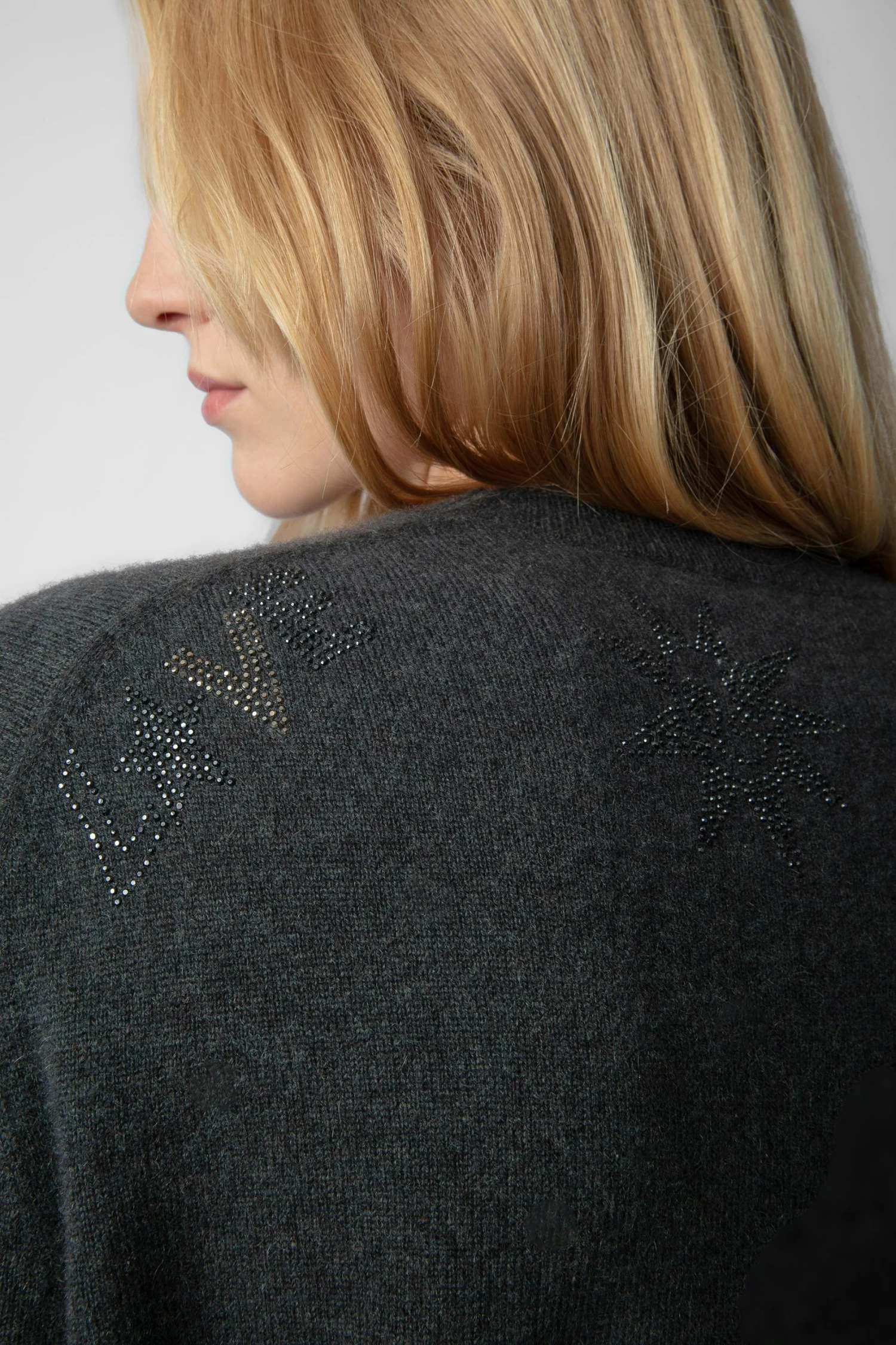 Khaki grey cashmere round-neck jumper with long sleeves, diamanté and customized details designed by Humberto Cruz.