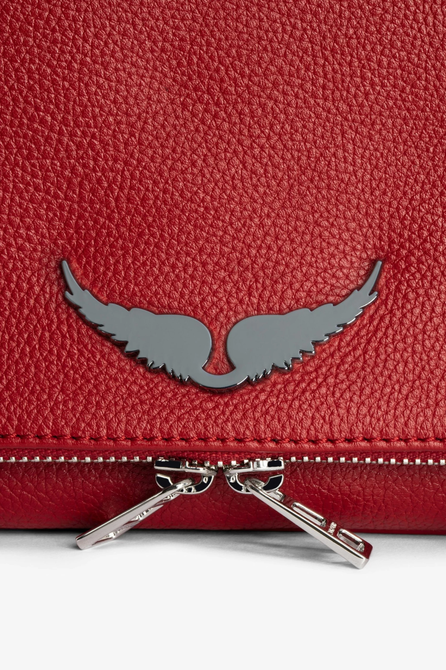 – Womenβs Power red grained leather Rock clutch – Black cotton lining – Removable double interwoven metal and leather chain strap – Metal mirror wings charm – Flap with zip and magnetic fastening – Small zip pocket on the back and inside patch pocket – Carry by hand, over the shoulder or across the body The Leather Working Group/LWG is a membership organization comprised of brands, suppliers, leather manufacturers and other stakeholders within the leather manufacturing industry. The group has developed an auditing program which certifies leather manufacturing facilities based on their environmental compliance and performance capabilities
