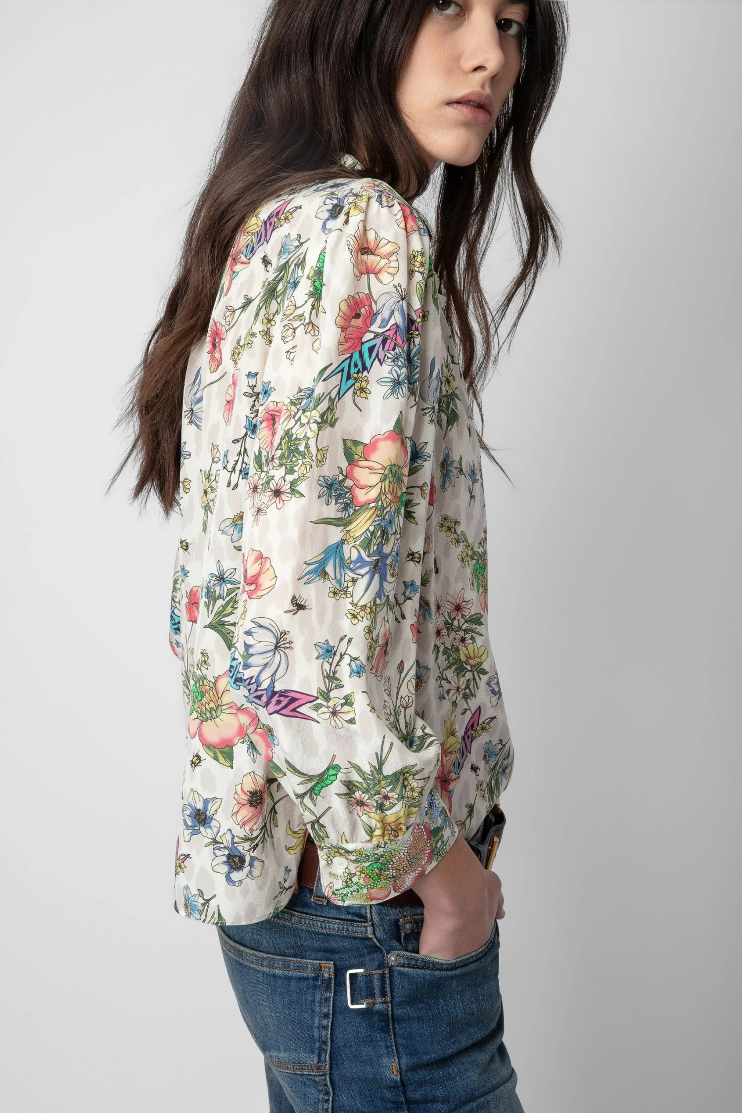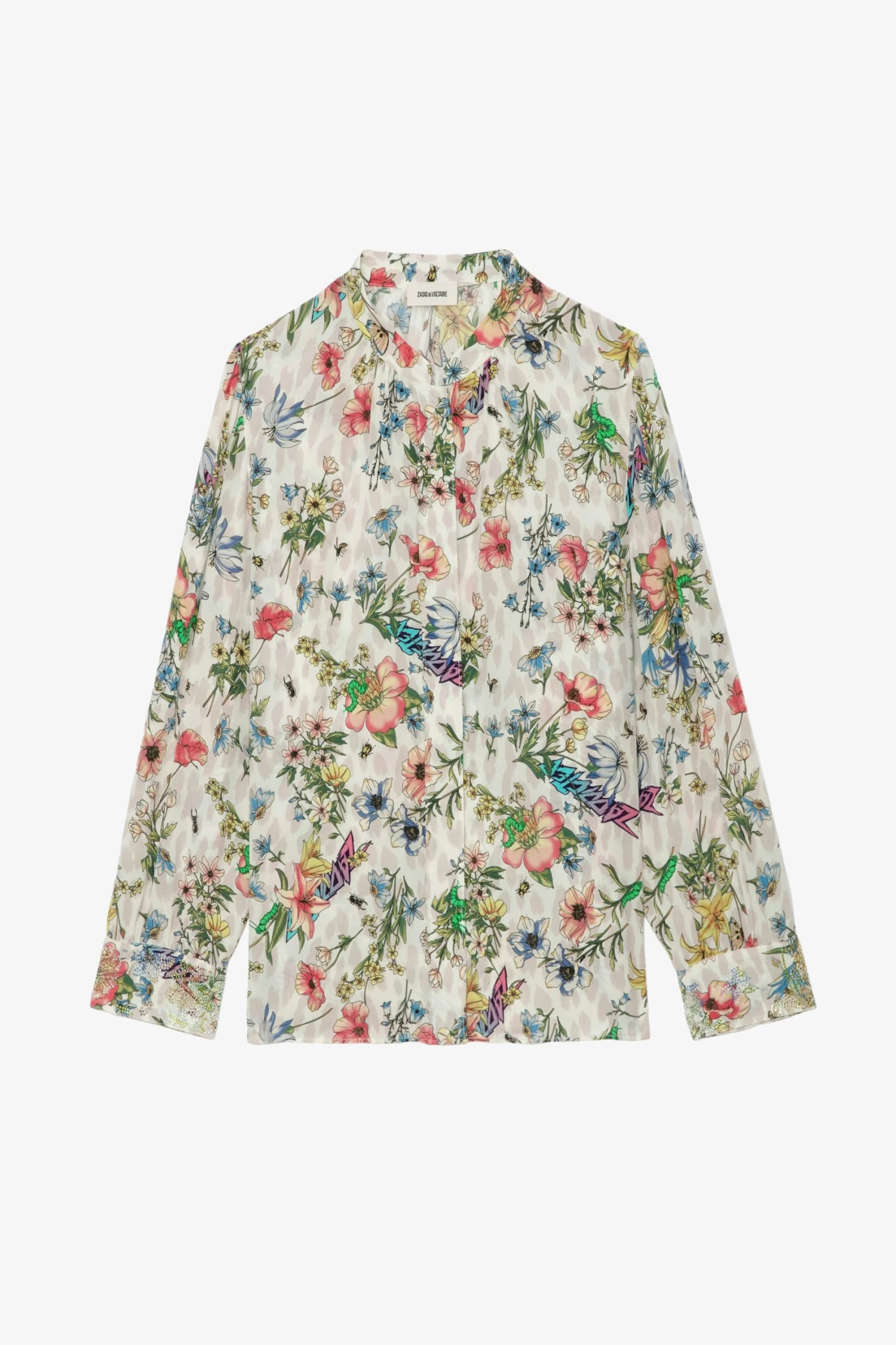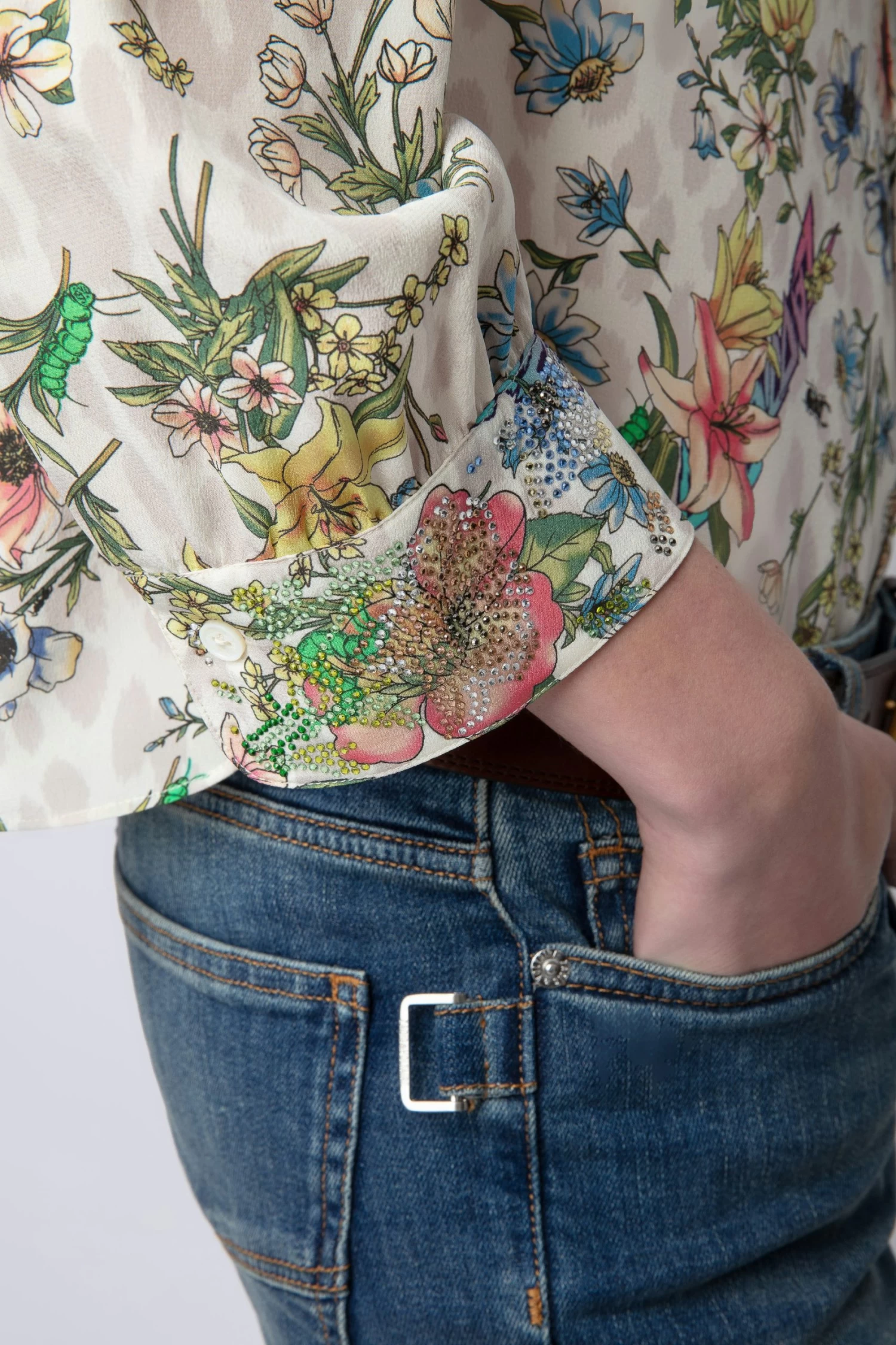 Ecru silk blouse with Twisted Garden print, 3u002F4-length sleeves and diamanté-embellished cuffs.