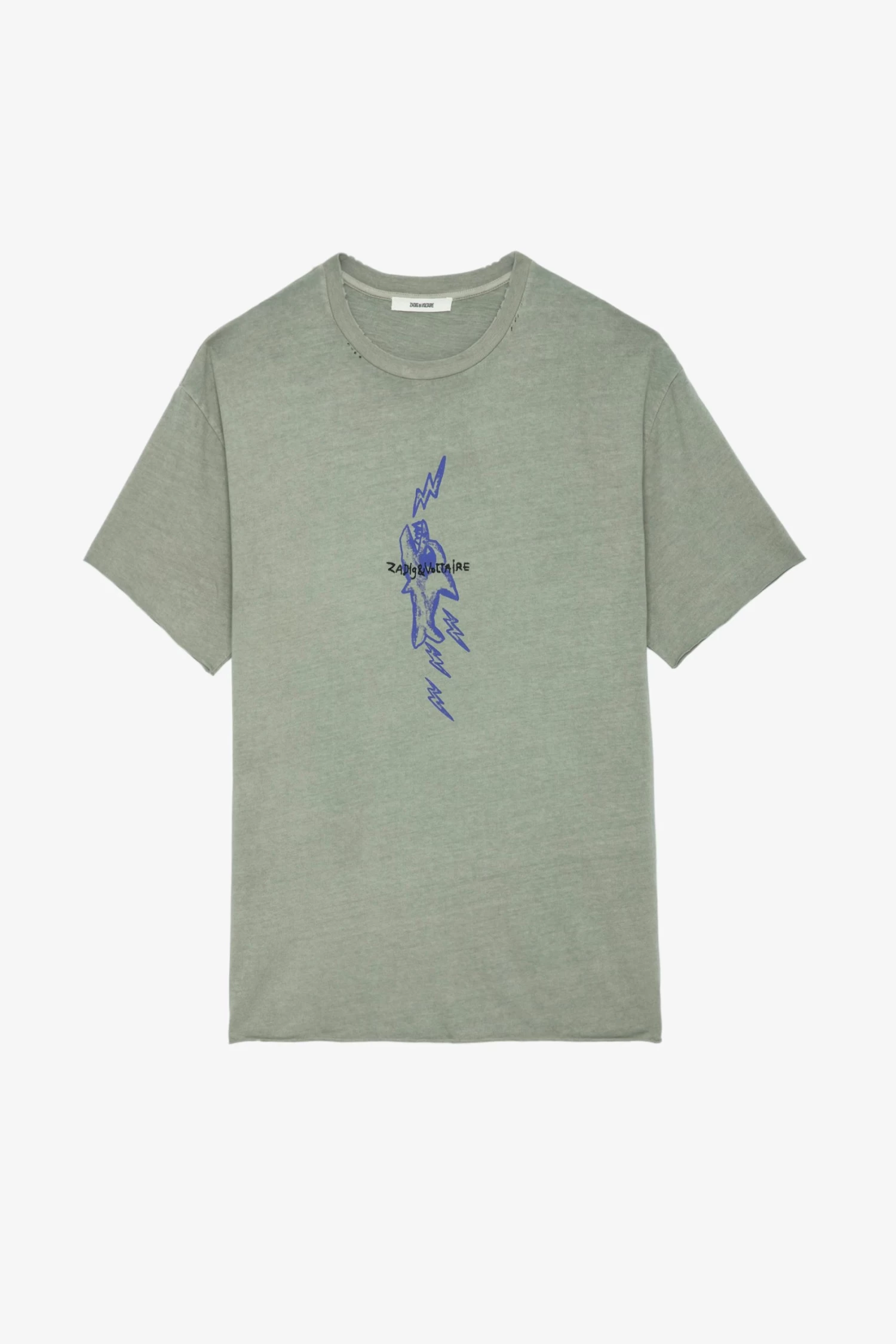– Men’s Trellis grey cotton T-shirt – Distressed effect – Shark print and Zadig&Voltaire signature on the front – Round neckline and short sleeves Model is 187 cm / 6′ 1″ and is wearing a size M*100% of fibers comes from organic agricultureThe GOTS certification guarantees that this product does not contain GMOs. It also ensures the absence of harmful substances in the product, a social and environmental responsible management and the end-to-end traceability of the supply chain. The dyes are made with GOTS approved inks and colorants, which do not contain toxic heavy metals and do not require aromatic solvents nor harmful substances.