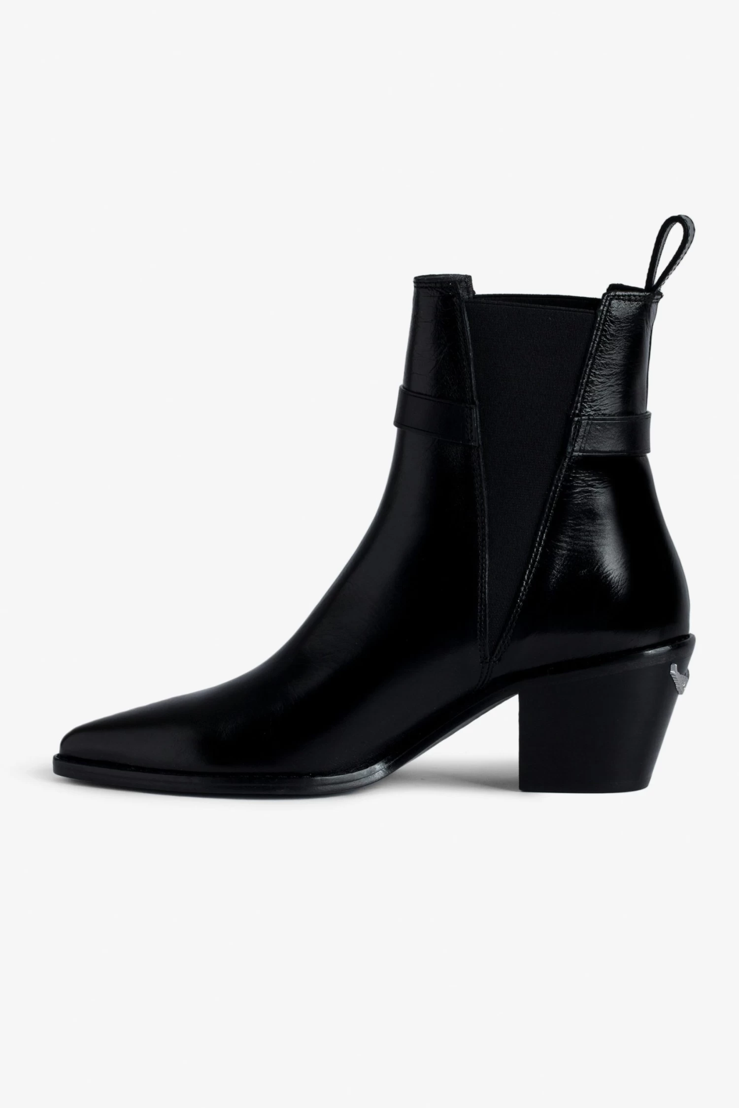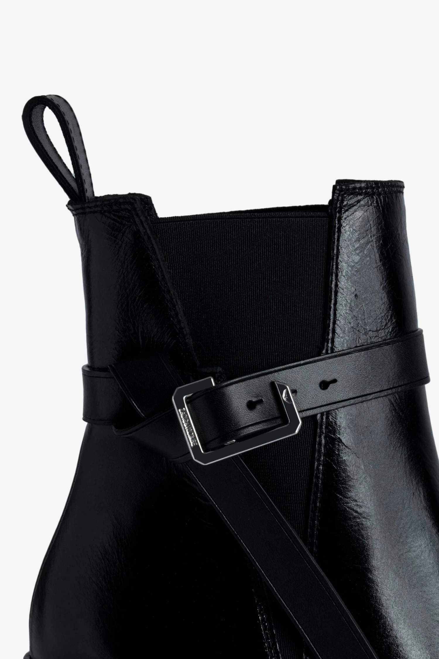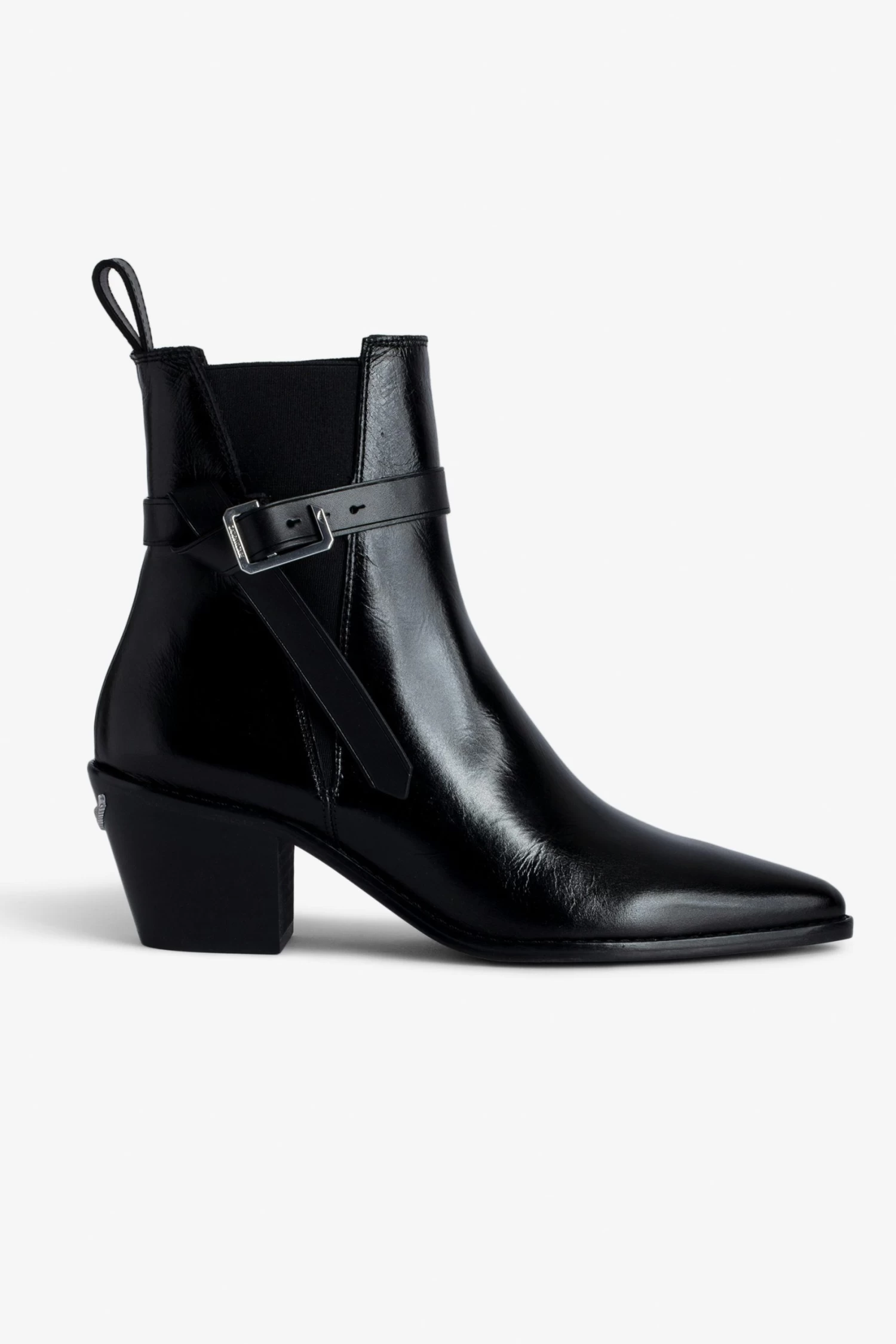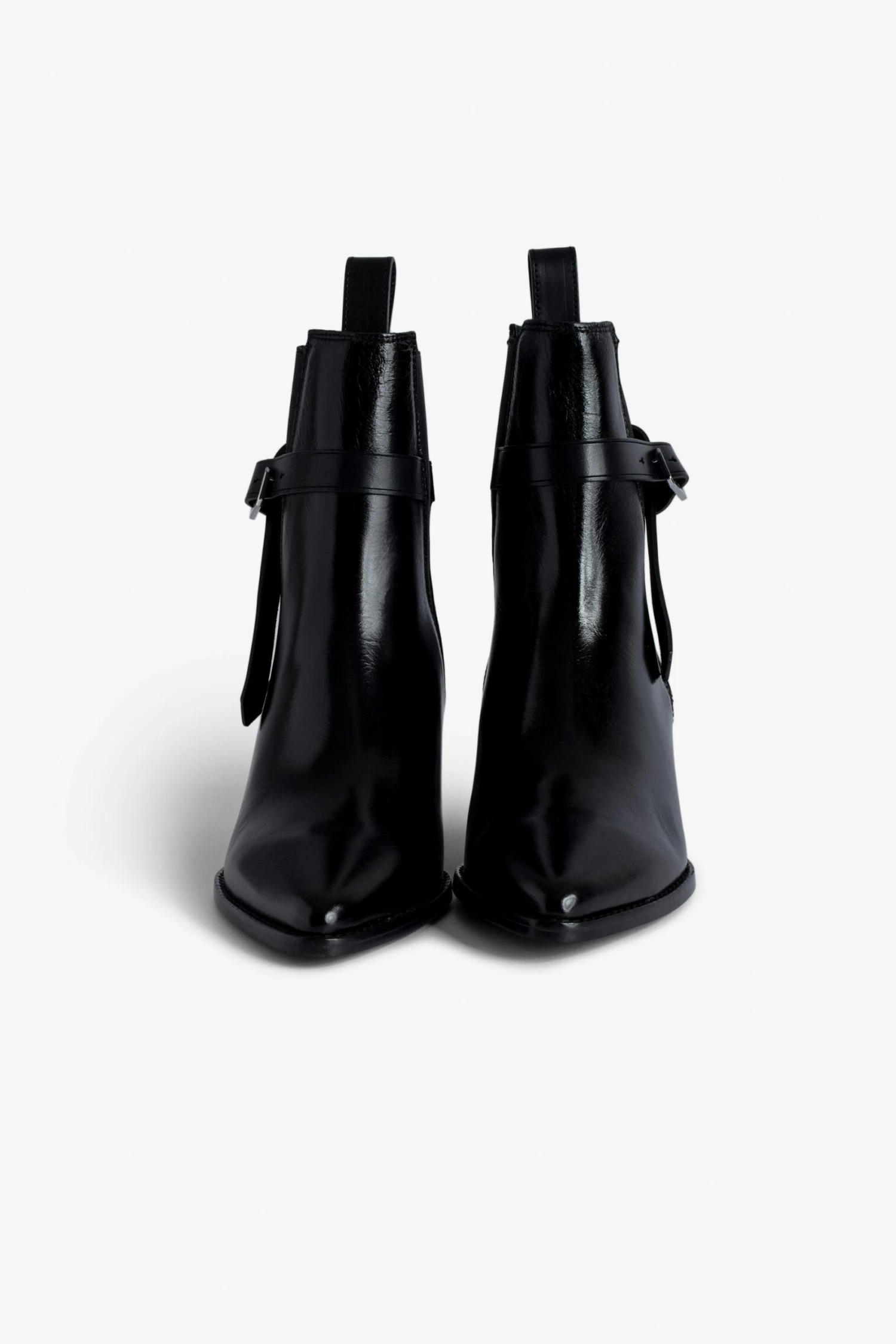 – Women’s black vintage-effect leather ankle boots – Adjustable strap with metal C buckle – Back tab and elasticated sides – Bevelled heels with wings charm – Heel height: 2.8 in – Made in Spain The Leather Working Group/LWG is a membership organization comprised of brands, suppliers, leather manufacturers and other stakeholders within the leather manufacturing industry. The group has developed an auditing program which certifies leather manufacturing facilities based on their environmental compliance and performance capabilities