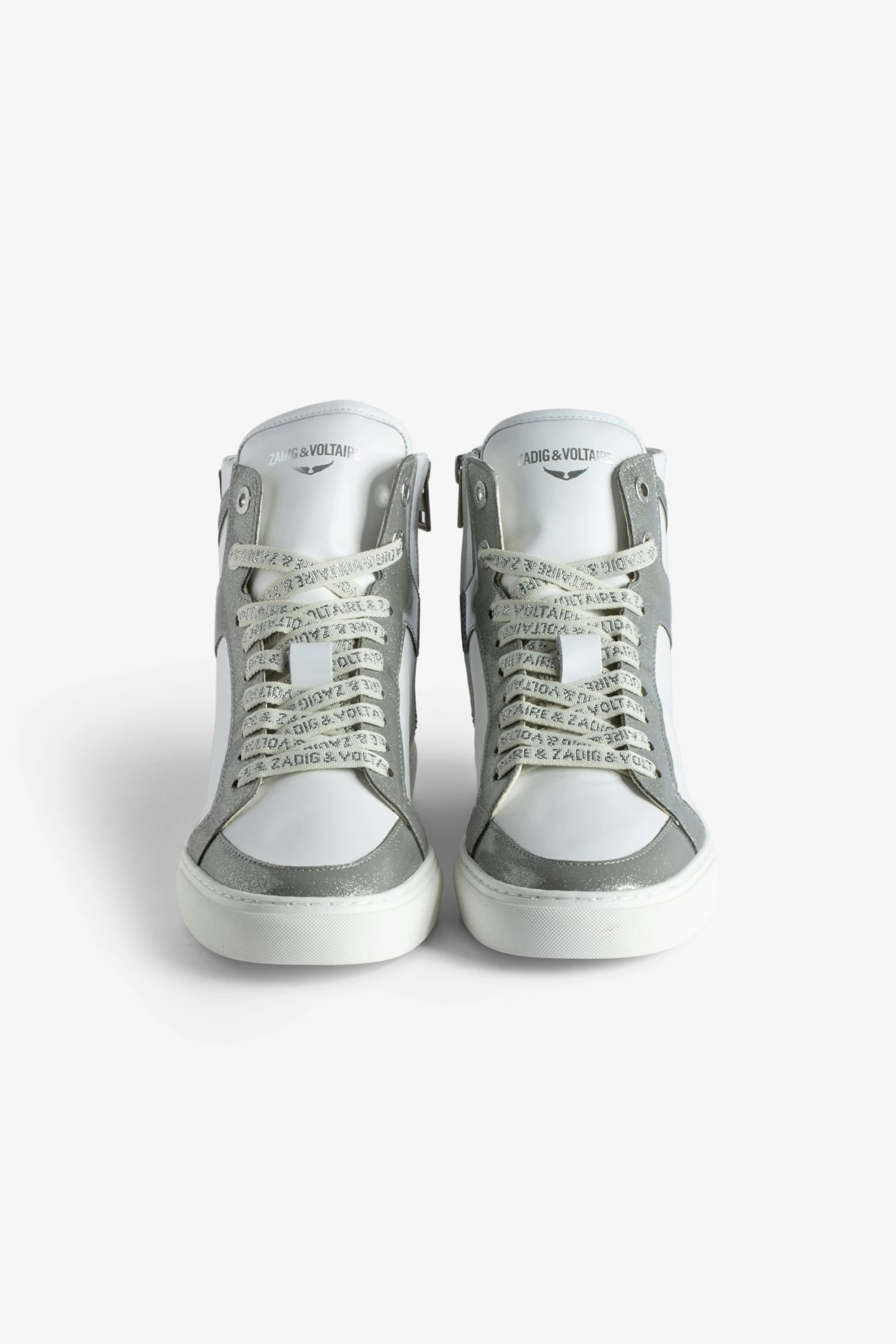 Women’s smooth leather and silver glitter high-top sneakers with lightning bolt panel.